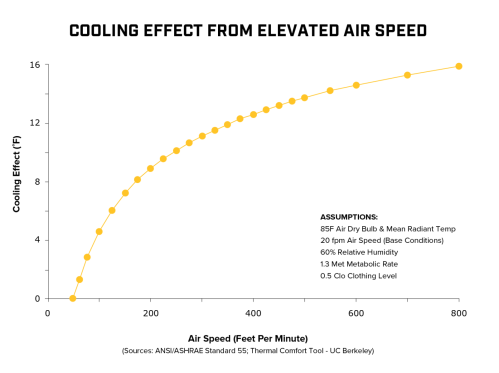 Big Ass Fans stir massive amounts of air, and as it moves across the skin, it speeds up sweat evaporation, which helps carry body heat away. By breaking up heavy, humid air and keeping it circulating, our fans help your team feel up to 10°F cooler even in unconditioned spaces.